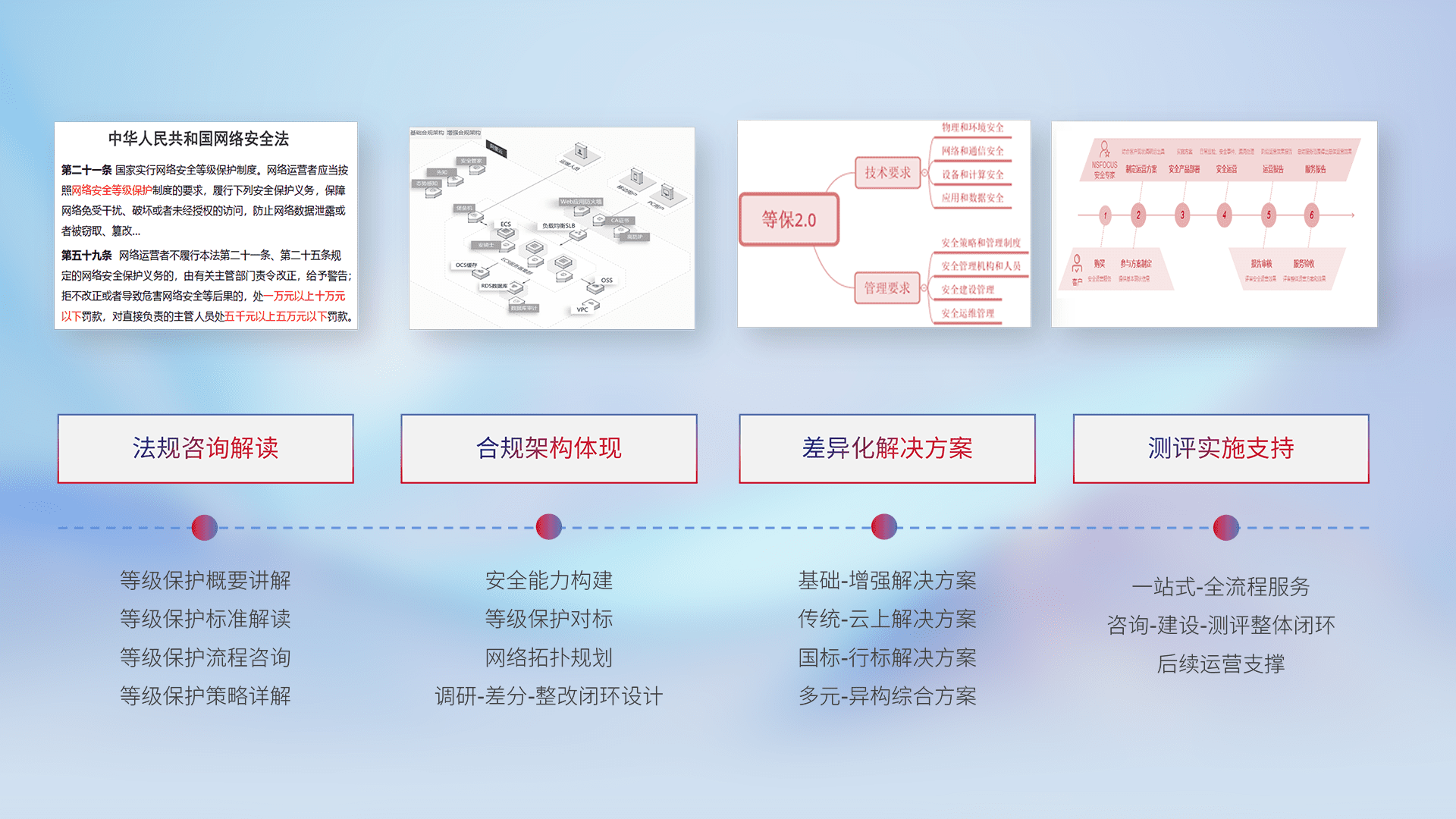 通过专业的法律咨询解读、、、、合规架构体现、、、、差异化解决方案、、、、测试实施支持等服务,,为客户量身打造等保合规体系。。。