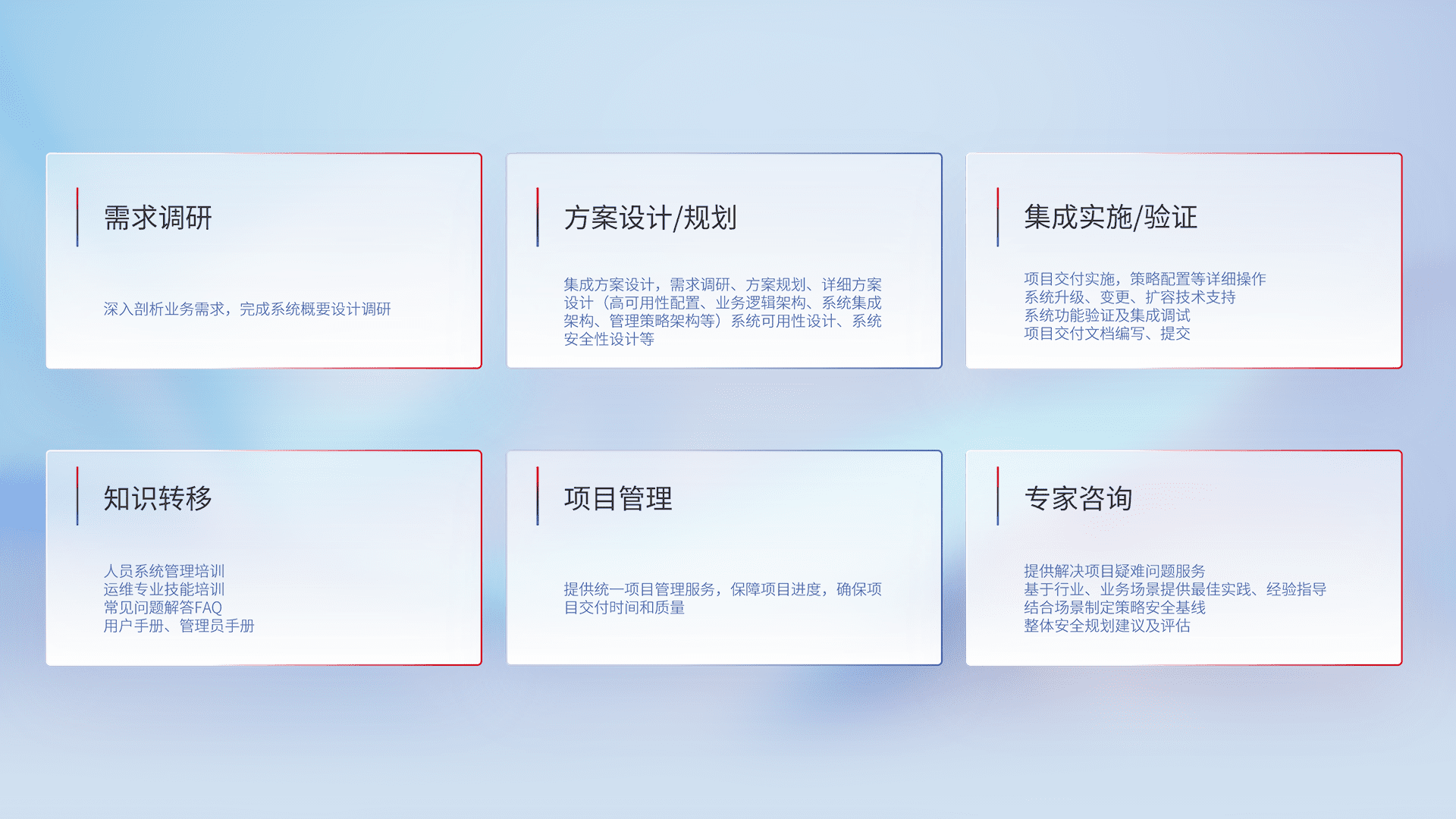 针对客户行业特性,,,,将宏观的安全战略和需求,,通过专业的交付服务,,实现项目落地,,,为客户提供标准规范的集成交付服务。。。。