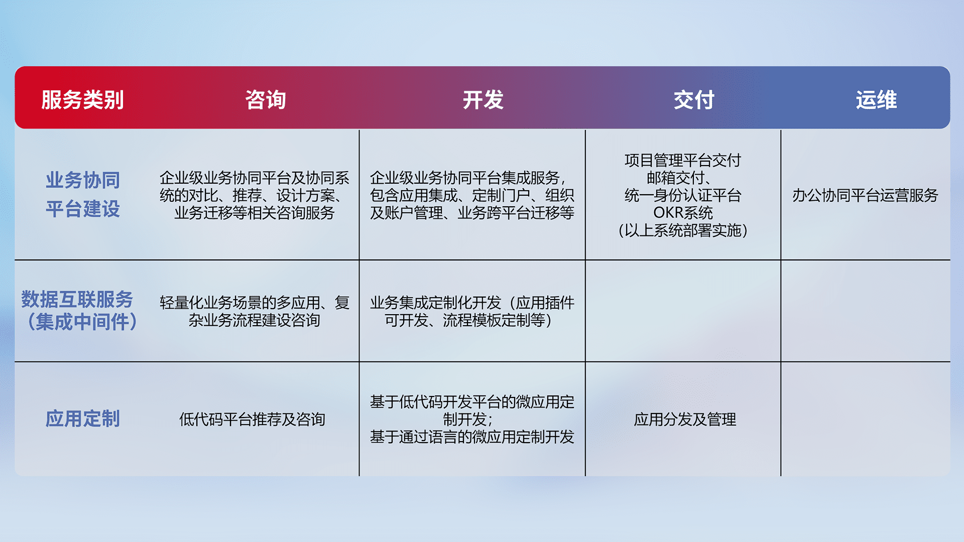 针对钉钉、、企微、、、、IDaas等平台级产品提供产品的规划、、方案、、、、交付、、、定制化开发等服务,,,实现如统一协同办公、、、、智能客户服务、、混合会议管理、、智能数据查询、、、、等业务场景,,实现数字化转型。。